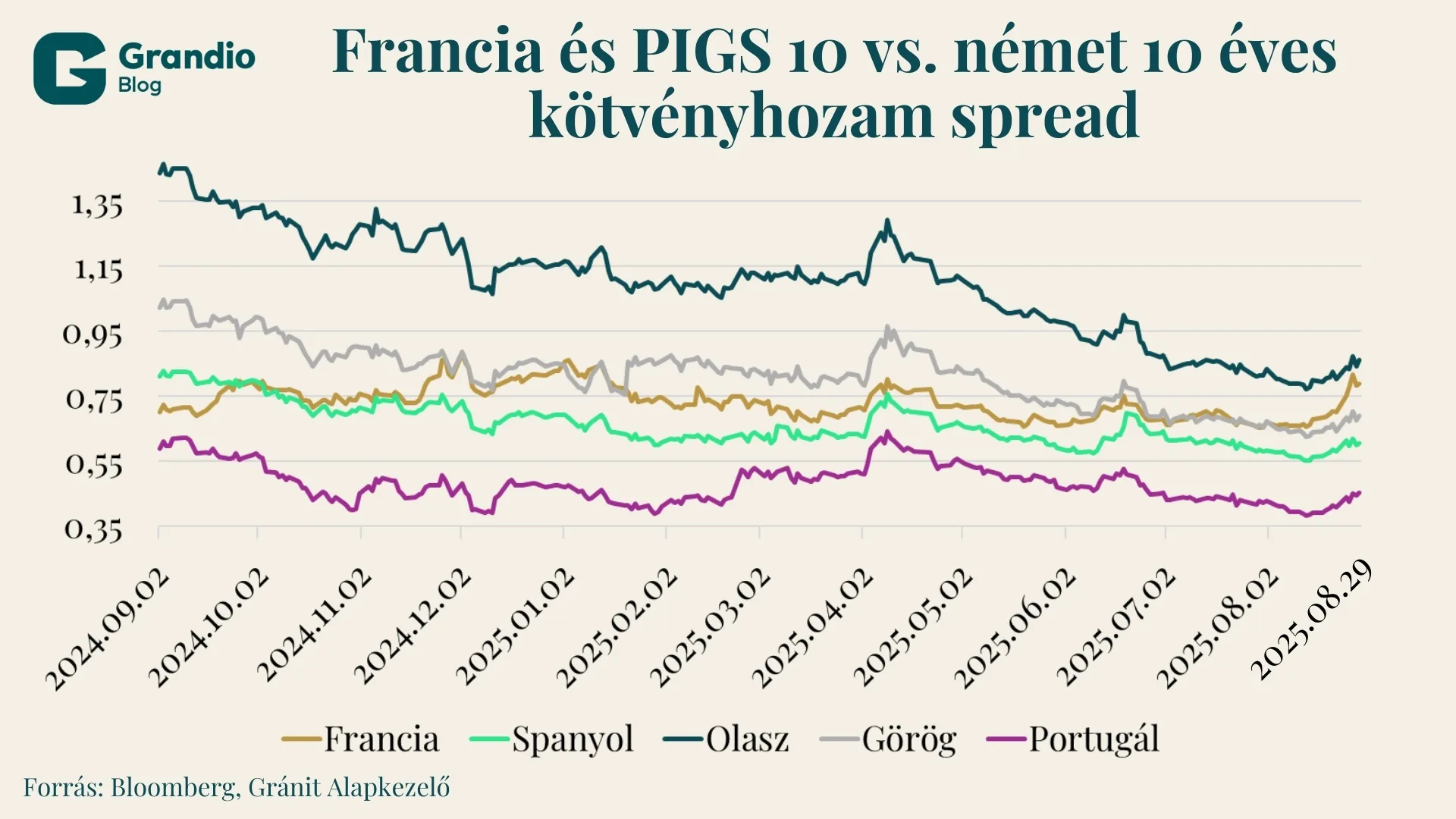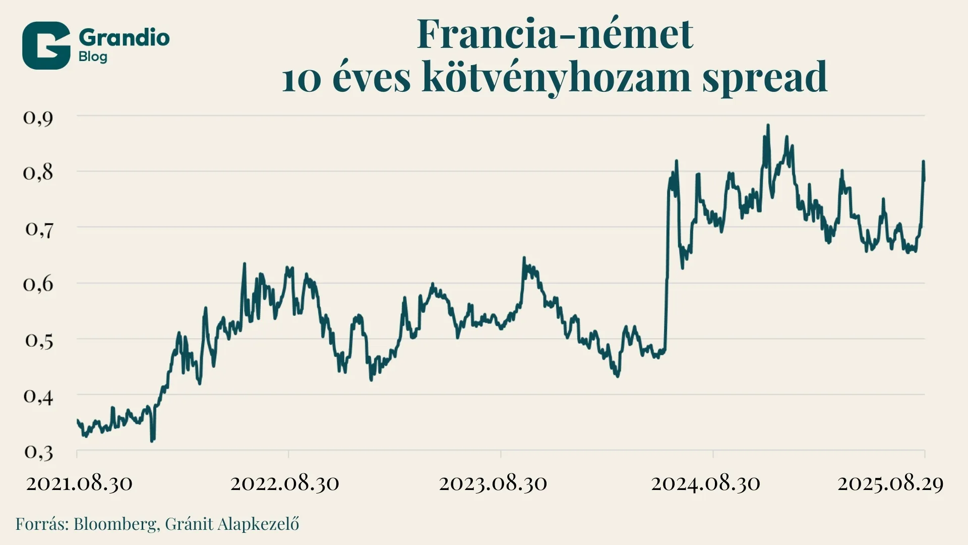 Franciaországban ismét nő a politikai kockázat: a kormányfő bizalmi szavazást kért maga ellen, miközben 43,8 milliárd eurós megszorító csomag készül. A francia–német kötvényhozam-spread 80 bázispontos csúcs közelébe ugrott, a hitelminősítők pedig leminősítést helyeztek kilátásba. Mit üzen mindez az európai piacoknak, és meddig feszülhet tovább a francia kockázati felár?