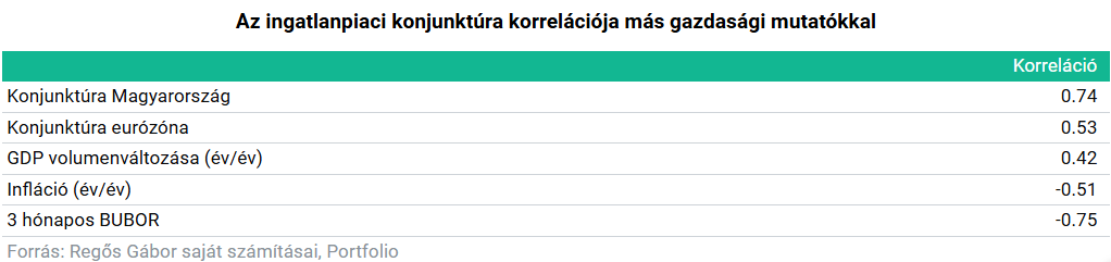 A második legerősebb korreláció a magyar konjunktúramutatóval volt, értéke 0,74. Azaz meghatározó az ingatlanpiac szempontjából, hogy a gazdaság egésze mennyire érzi jónak a gazdaság ciklikus helyzetét. A harmadik legerősebb korreláció az eurózóna konjunktúramutatójával volt, itt az együttható értéke 0,53. Ettől nem sokkal marad el az inflációval vett korreláció erőssége, -0,51 az együttható. Meglepően gyenge, de pozitív az együttmozgás a GDP-vel, itt az együttható értéke 0,42.